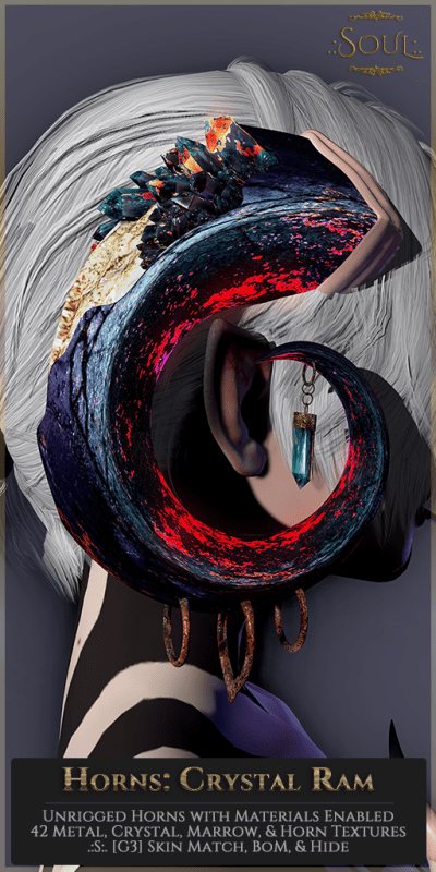 Unrigged Horns with Materials Enabled, 42 textures for Crystals, Piercings, Marrow and all 16 Matching .:S:. [G3] Skins for the base, which is also able to be hidden completely or tinted to match, and has BoM (may conflict with hairbases & tattoos).