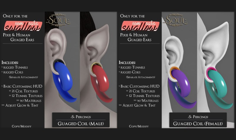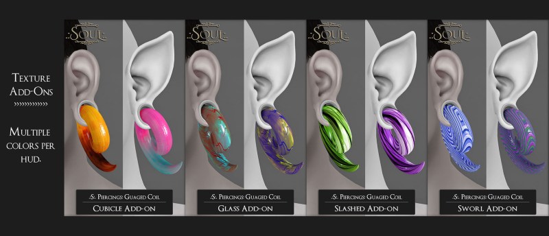 The Male or Female base sets include sets that fit both human and pixie ears, Tunnels, Coils, and the both connected along with solid color textures.